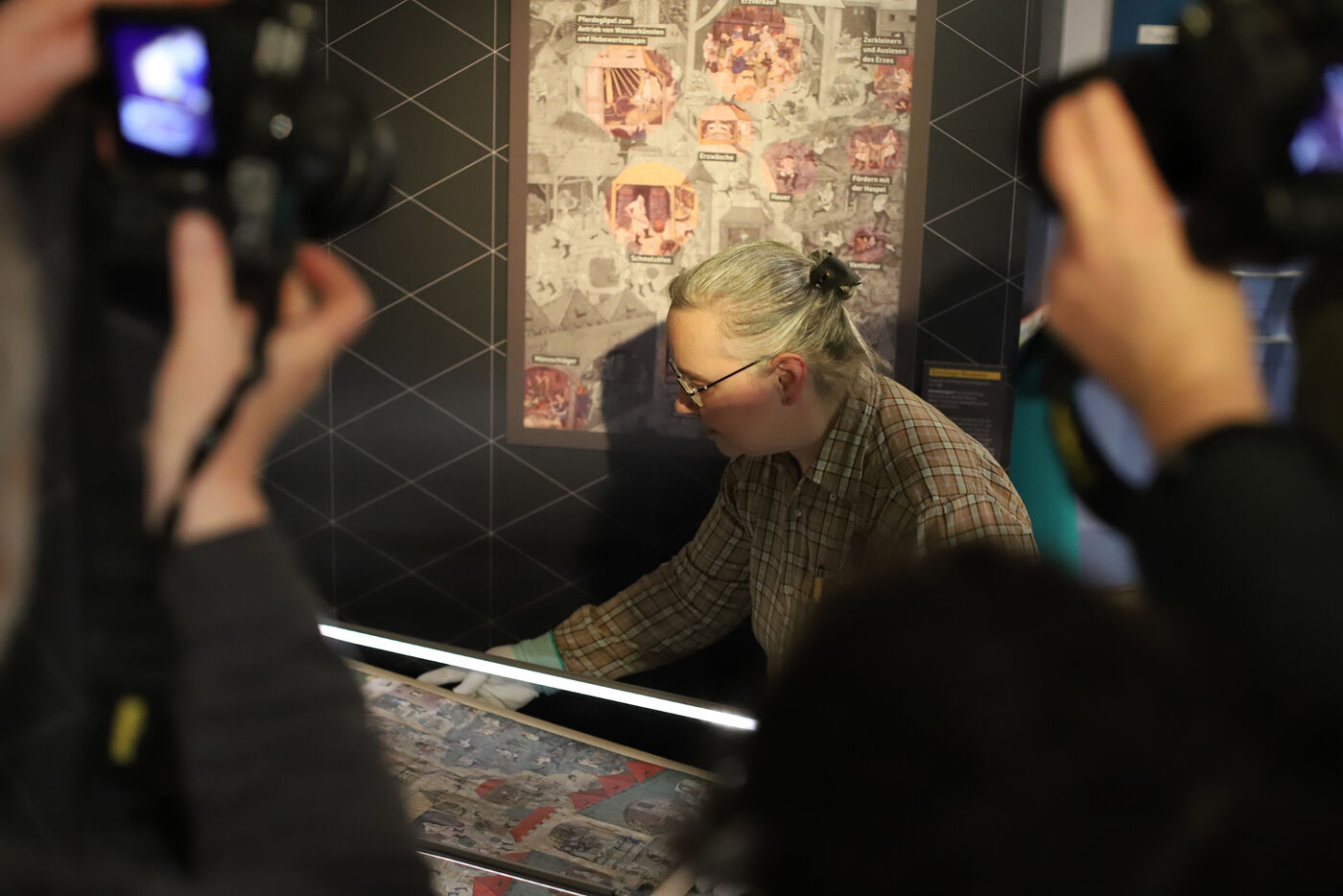 - Restauratorin Gabriele Wagner vom Landesamt für Archäologie Sachsen bringt das wertvolle "Wimmelbild" in seine Vitrine in der Sonderausstellung "Silberglanz & Kumpeltod" ein.