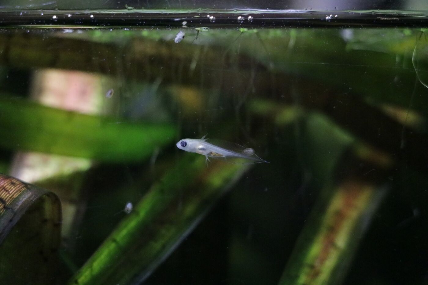- Eine von ca. 10 bis 15 Larven der Anatolischen Kammmolche, die im Vivarium des Tierparks Chemnitz geschlüpft sind