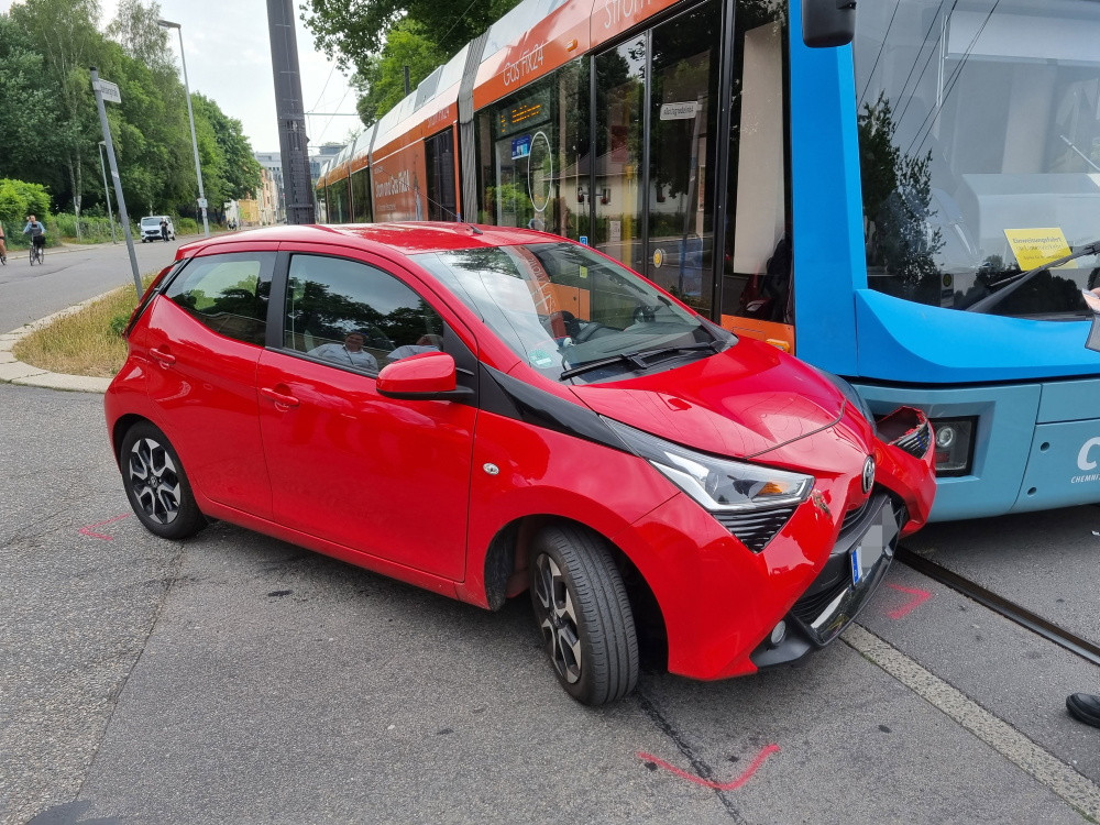 Auf der Augustusburger Straße ist am Mittwochabend ein Auto in eine Straßenbahn gefahren. Die 54-jährige Fahrerin hatte die Gleise in Höhe Reineckerstraße mit ihrem Auto überquert und dabei offenbar die herannahende Bahn der Linie 5 übersehen. Die Frau wurde leicht verletzt.
