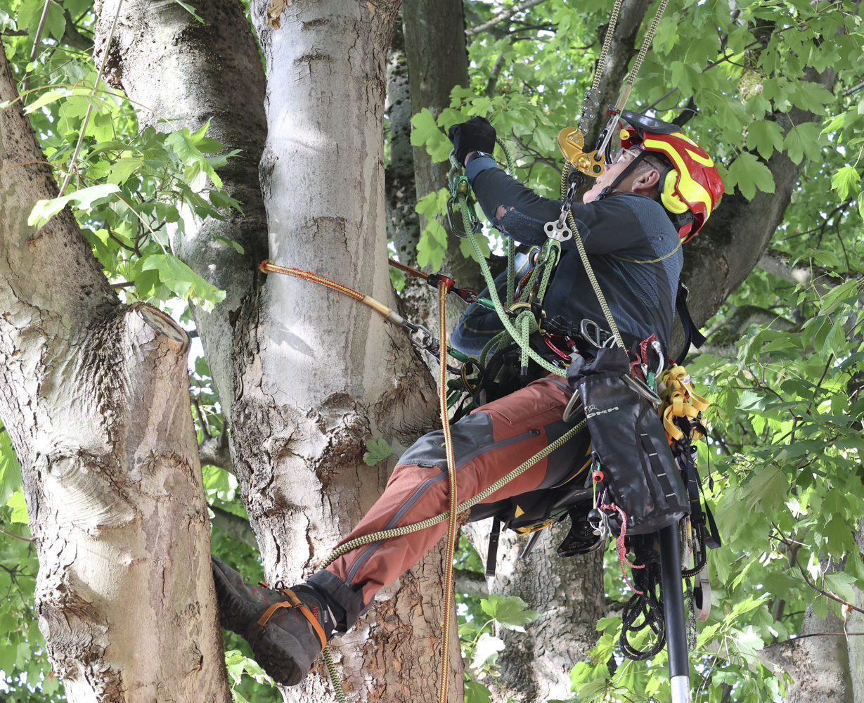 • Baumretter Laabs kletterte in die Krone des Ahorn, um ihn zu schützen.