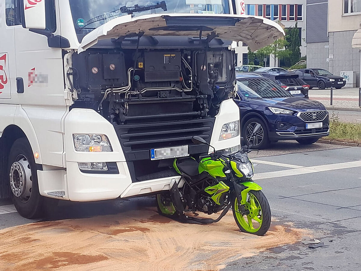 Bei einem spektakulären Auffahrunfall in der Chemnitzer Innenstadt hatte ein Motorradfahrer großes Glück. Am Freitagmittag fuhr ein LKW an der Kreuzung Bahnhofstraße / Brückenstraße auf das Krad auf. Der Motorradfahrer konnte sich mit einem Sprung vom Bike retten und blieb unverletzt. Zur Schadenshöhe und zum Alter des Bikers ist bislang nichts bekannt. Eine Ölspur musste beseitigt werden. Der Verkehr wurde am Unfall vorbei geleitet, es kam zu einem kurzzeitigen Stau.
