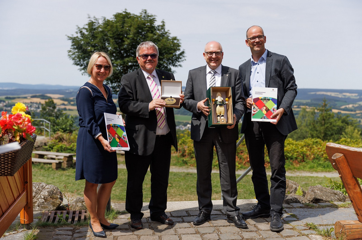 - TVE-Geschäftsführerin Ines Hanisch-Lupaschko, Landrat Frank Vogel, Oberbürgermeister Sven Schulze und CWE-Geschäftsführer Sören Uhle (v.l.) nach der Unterzeichnung der Kooperationsvereinbarung.
