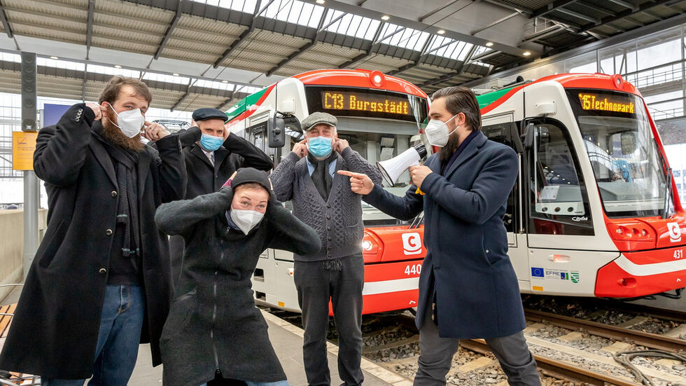 In den Zügen der Chemnitzer City-Bahn wird schon länger mit lustigen Bandansagen auf die Maskenpflicht hingewiesen, jetzt sind dabei auch neue Stimmen zu hören. Nach Tom Pauls nehmen diesmal Chemnitzer Kabarettisten das Mikro in die Hand.