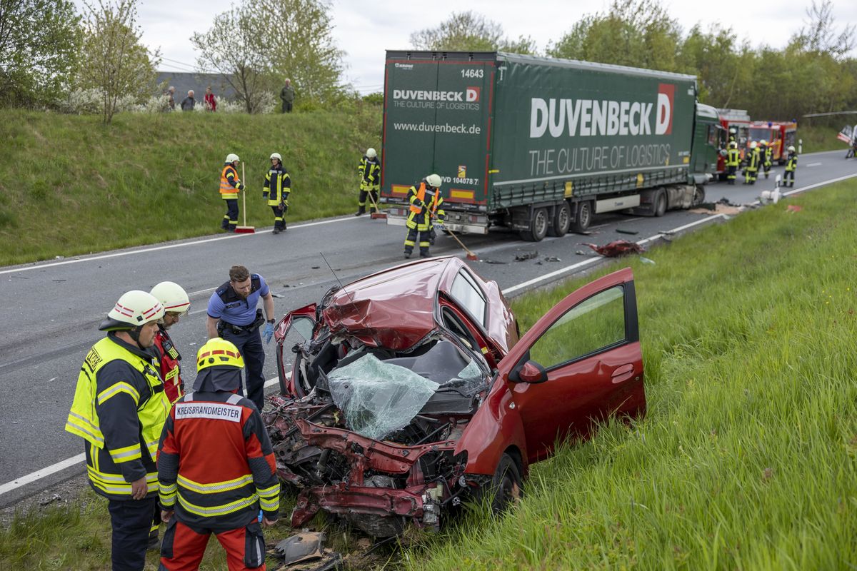 Der Dacia gleicht einem Trümmerhaufen. Auch am LKW entstand hoher Sachschaden, so ein Reporter vor Ort. Die B 174 war für Stunden voll gesperrt.