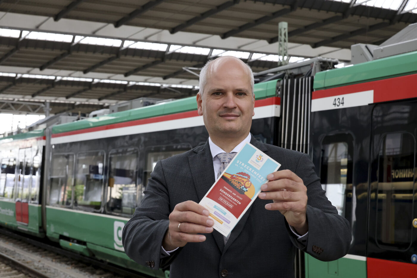 City-Bahn-Chef Friedbert Straube erklärt augenzwinkernd: „Wer will im grauen November schon ein Bahnfest feiern? Deshalb haben wir die Feier etwas vorgezogen und hoffen auf gutes Wetter.“