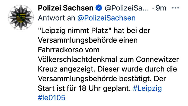 17:59 Uhr: Fahrradkorso zum Connewitzer Kreuz genehmigt