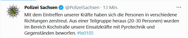 Gegen 20:45 Uhr wurde dann eine Gruppe von rund 100 Teilnehmern im Bereich des Täubchenwegs festgestellt. Während des Aufzugs wurde Pyrotechnik gezündet und Mülltonnen auf die Straße gestellt. Es wurde eine Anzeige wegen des Verstoßes gegen das Sächsische Versammlungsgesetz erstattet.