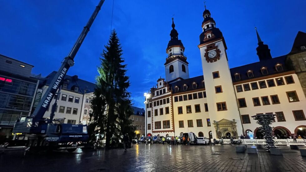 Hunderte Chemnitzer haben am Samstagnachmittag auf dem Markt die Ankunft des Weihnachtsbaumes gefeiert. Gegen 16 Uhr bog der Tieflader mit dem Baum auf die Innere Klosterstraße ein und fuhr dann zum Markt, wo er mit einem Kran aufgestellt wurde. Die rund 27 Meter hohe Fichte war am Vormittag in Tannenbergstal, im Vogtland gefällt worden. Durch das Aufstellen hat sie noch einmal etwa 2 Meter an Höhe verloren, sodass der Baum den Markt nun mit rund 25 Metern überragt. Am Montag kommt die Beleuchtung. Der Chemnitzer Weihnachtsmarkt eröffnet am 1. Dezember.