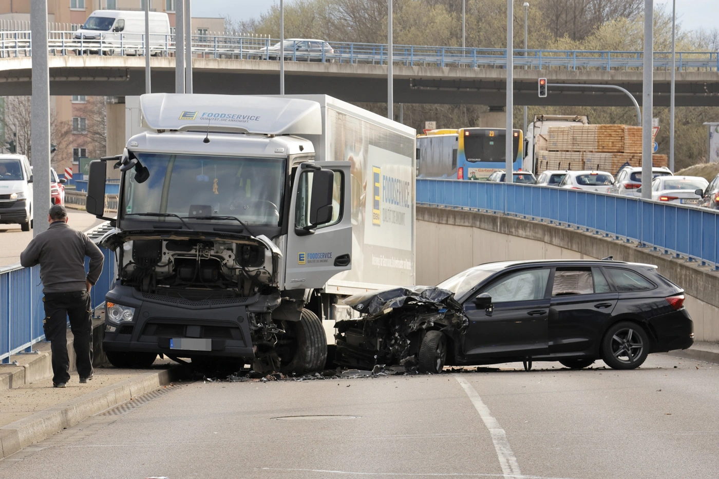 Auf der Neefestraße hat es heute Morgen am Überflieger zum Südring einen schweren Unfall gegeben. Gegen 8 Uhr war ein 35-jähriger Skoda-Fahrer stadteinwärts unterwegs. Aus noch ungeklärter Ursache geriet er auf die Gegenfahrbahn. Dort stieß er frontal mit einem LKW zusammen.