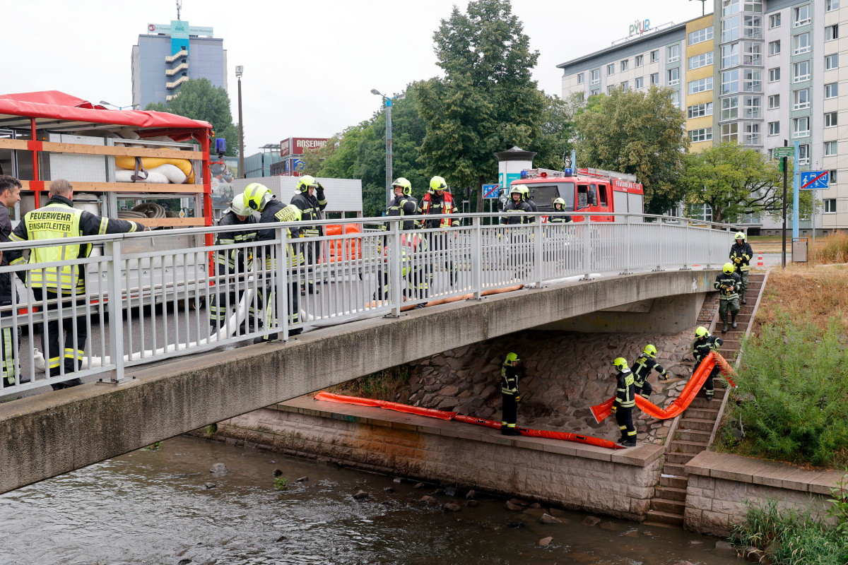 Feuerwehr errichtet Ölsperre in der Chemnitz