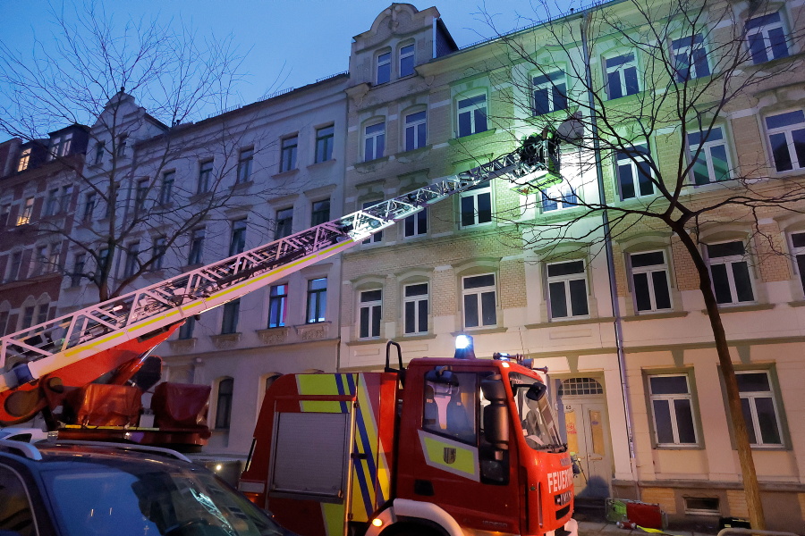 - Mit einer Drehleiter gelangte die Feuerwehr durch ein Fenster in das Haus.