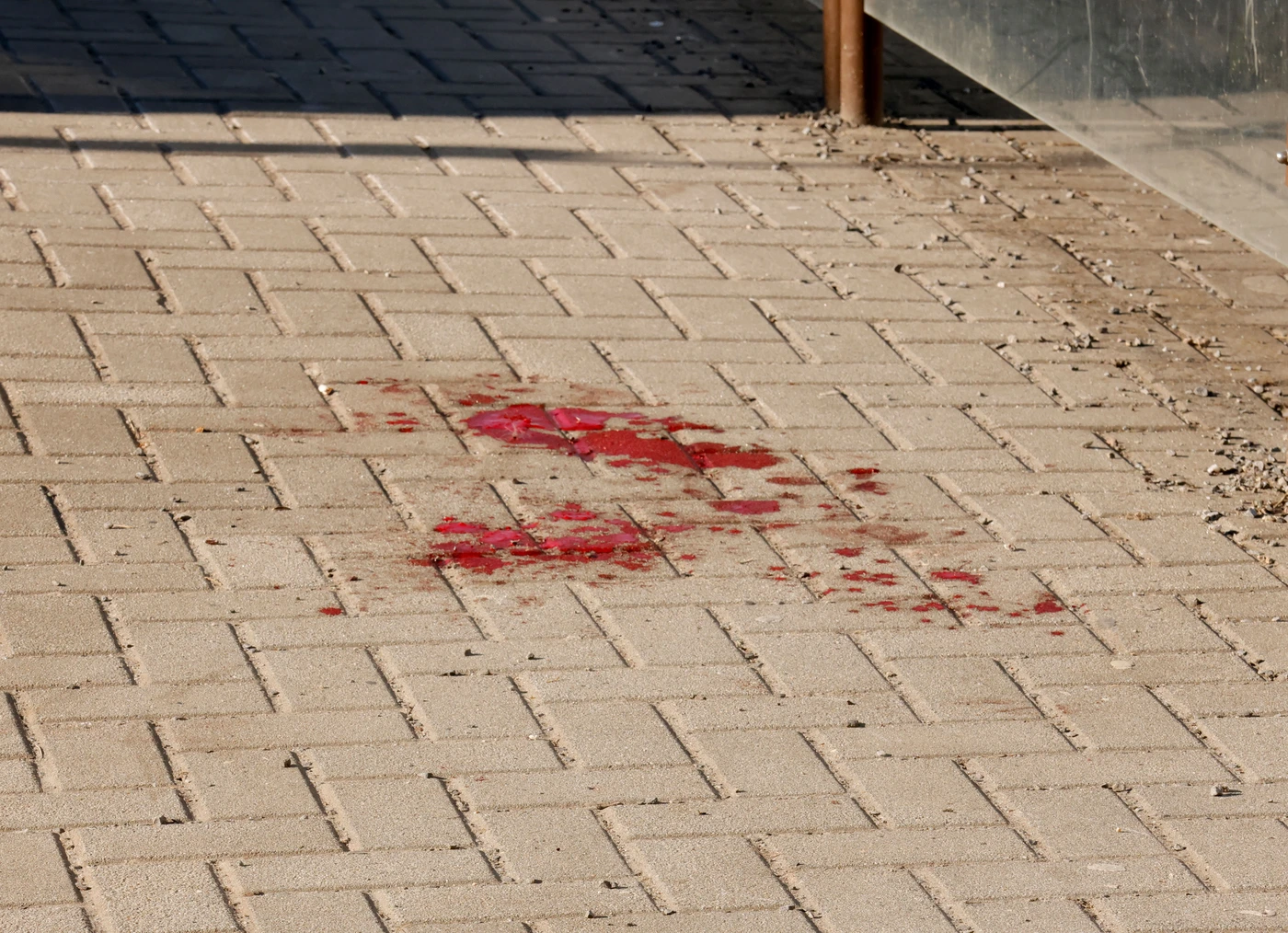 - Eine Blutlache auf den Pflastersteinen der Straßenbahnhaltestelle zeugt von dem Unfall.