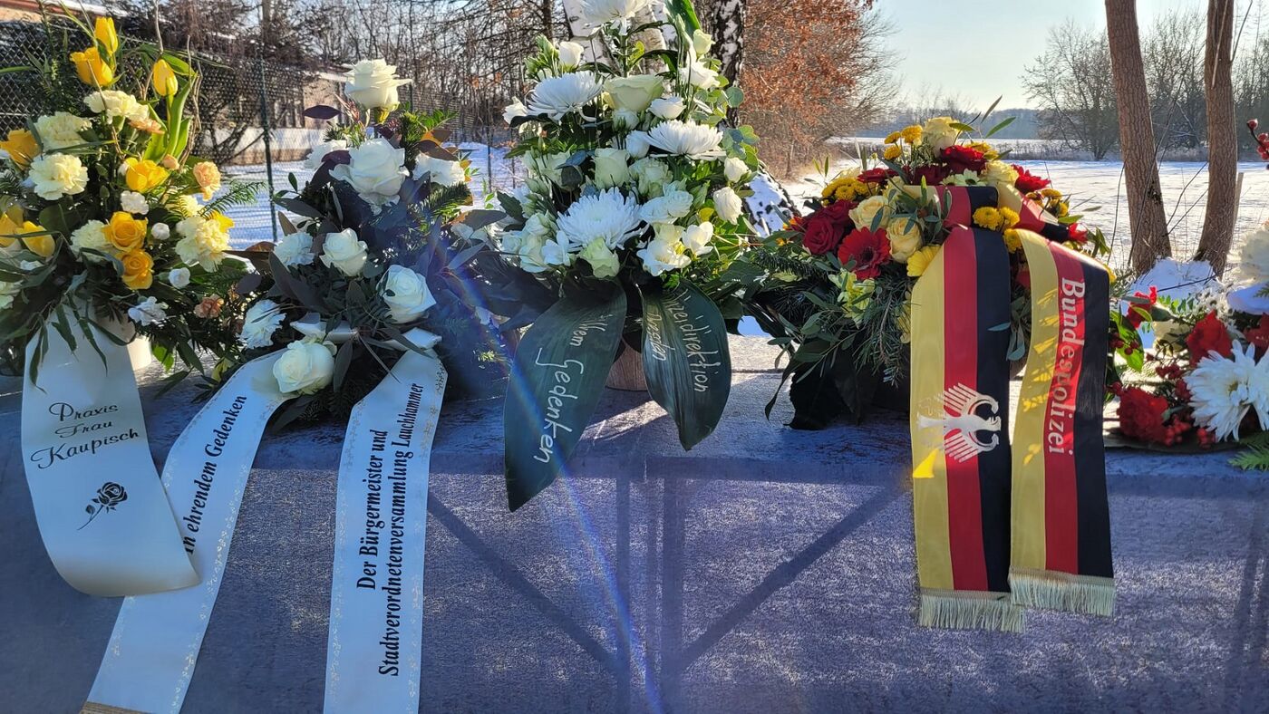 Mit einer Schweigeminute ist am Dienstag an den vor einem Jahr in Lauchhammer getöteten Polizisten aus Sachsen erinnert worden. Um 11.24 Uhr nahmen Kollegen am Tatort an der Bockwitzer Straße ihre Mützen ab. Polizisten in Sachsen unterbrachen ihre Arbeit und hielten inne. Die Ministerpräsidenten von Sachsen und Brandenburg, Kretschmer und Woidke, legten Gestecke nieder.