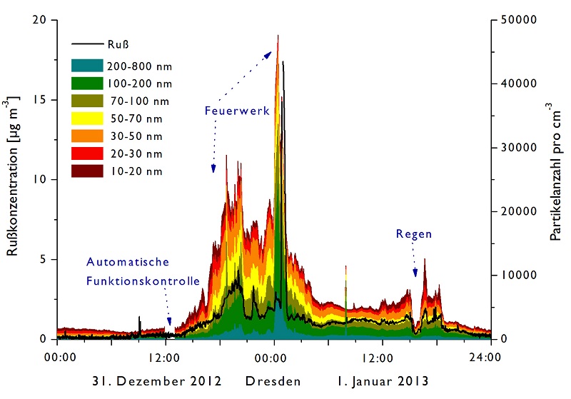 - Wie die Feinstaubbelastung in der Silvesternacht steigt, zeigt diese Grafik einer Messstation in Dresden. (c) LfULG/EU-Projekt UFIREG