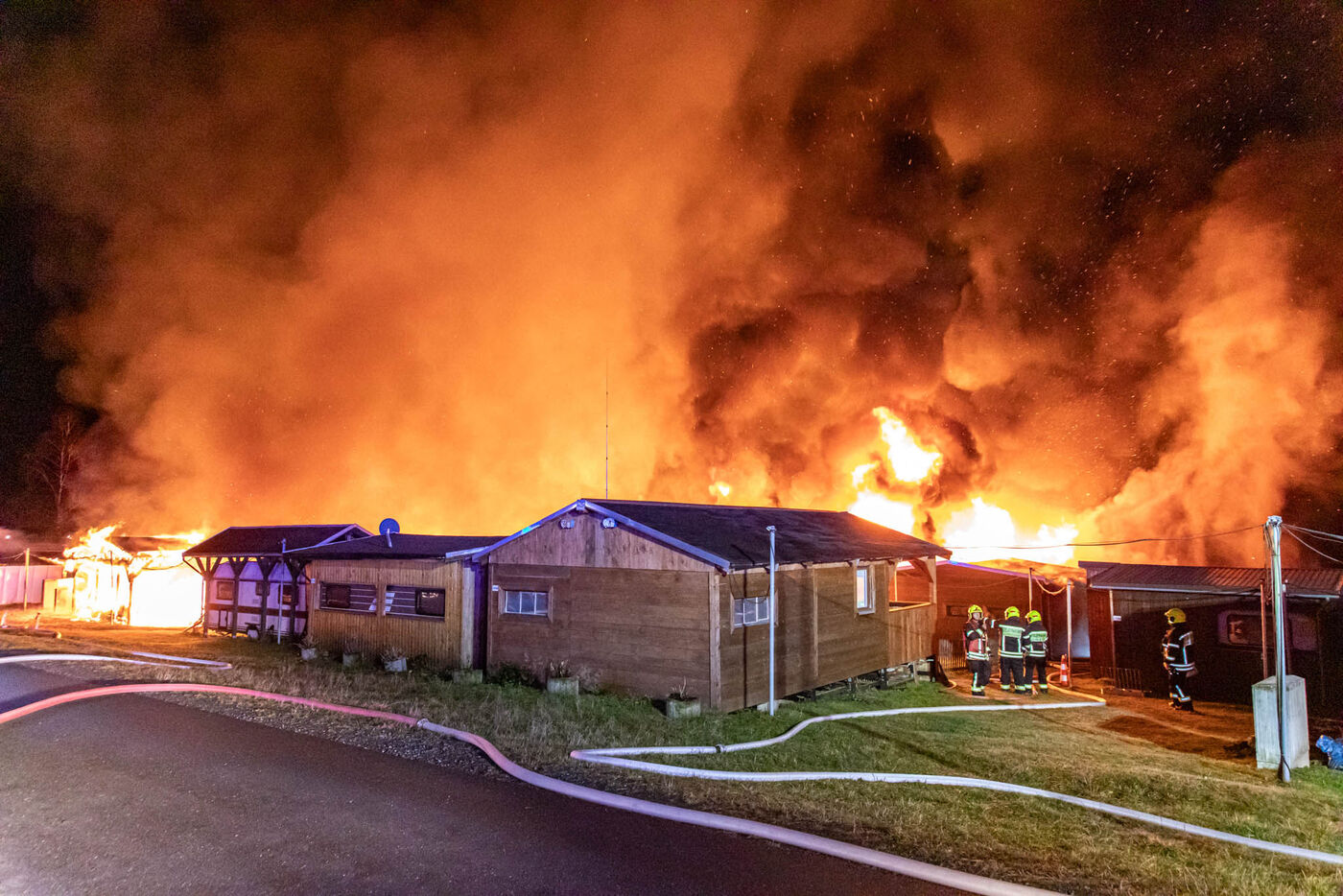 Der Brand war gegen 1:50 Uhr ausgebrochen. Die Löscharbeiten gestalteten sich schwierig, da explodierende Gasflaschen die Einsatzkräfte behinderten.