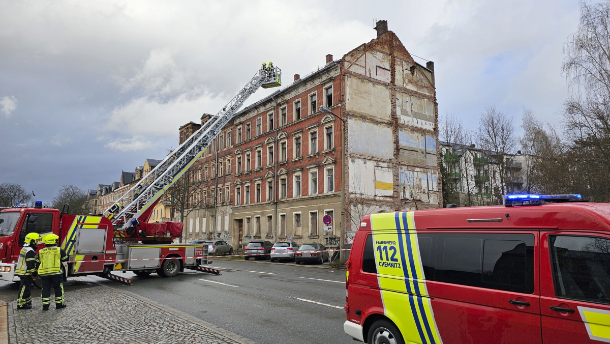 In Schlosschemnitz musste die Feuerwehr am Montagmittag zu einem Abbruchhaus ausrücken. In dem leerstehenden Gebäude am Zöllnerplatz war eine Zwischendecke eingestürzt und Teile der Außenfassade abgebrochen. Einige Brocken fielen auf die Straße und den Gehweg, ein davor geparktes Auto wurde beschädigt. Verletzt wurde niemand. Die Höhe des Sachschadens ist noch nicht bekannt. Wegen des Feuerwehreinsatzes musste die Straße voll gesperrt werden.