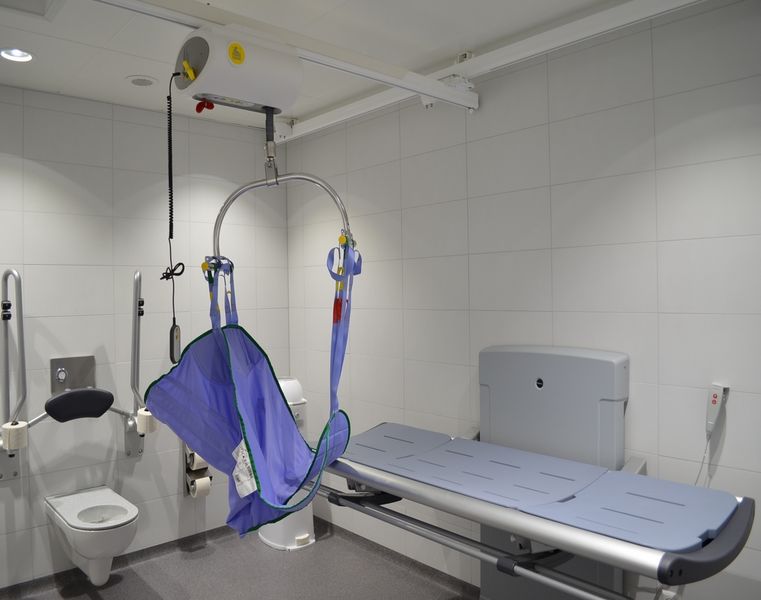Hoffentlich müssen Sie das nie sehen. Die Liege. Den Lifter. Den Raum. Aber gut zu wissen, dass diese Toilette da ist.