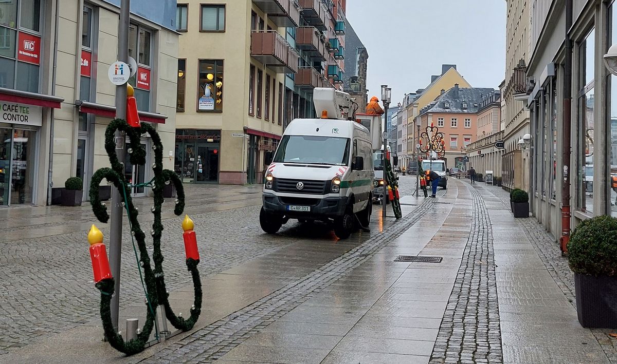 In der Innenstadt laufen die letzten Vorbereitungen auf den Weihnachtsmarkt. Am Freitagnachmittag wird er feierlich eröffnet. Ab heute tauscht der Energieversorger eins nun auch die Straßenlaternen in der Fußgängerzone rings ums Rathaus gegen die Weihnachtsbeleuchtung aus.