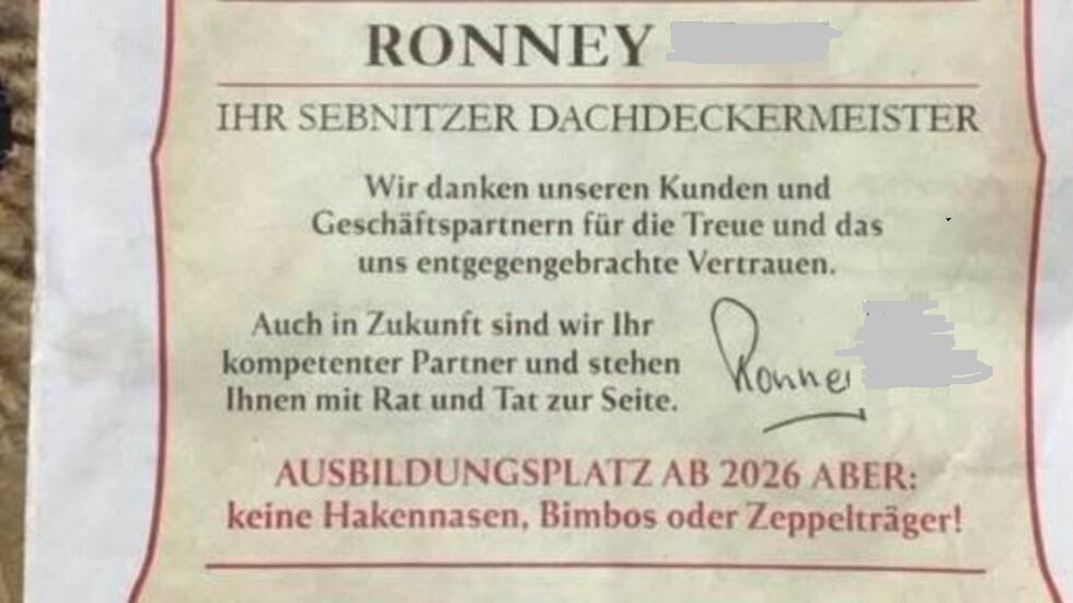 Ein Dachdeckermeister aus Sebnitz sorgt mit einer rassistischen und antisemitischen Anzeige für Entsetzen. Im Amtsblatt der Stadt sucht er Azubis, aber, Zitat: „keine Hakennasen, Bimbos oder Zeppelträger“.
