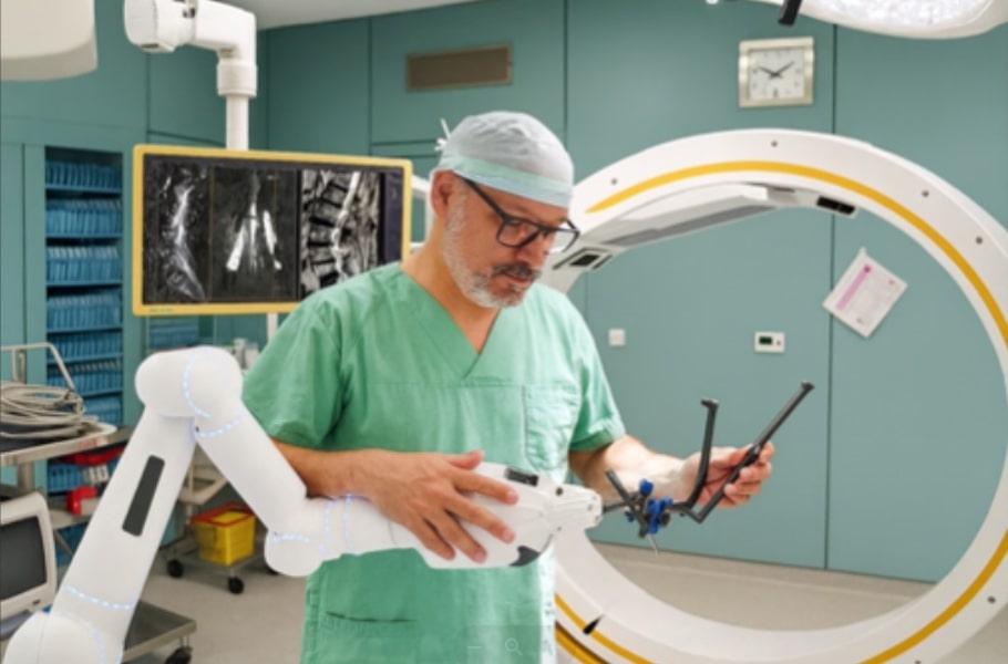 - Prof. Dr. med. Matthias Kirsch ist einer der Ärzte, die im Wirbelsäulenzentrum tätig sind. Auf dem Foto ist die Ct-ähnliche Bildgebung im OP sowie der gelenkte robotische Arm für Wirbelsäuleneingriffe.