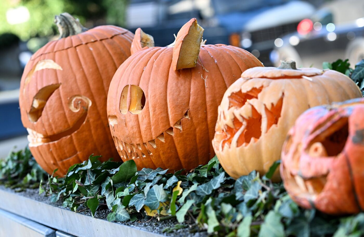 - Ausgehöhlte Kürbisse mit gruseligen Fratzen in einem Vorgarten in Frankfurt am Main. (Archivbild)