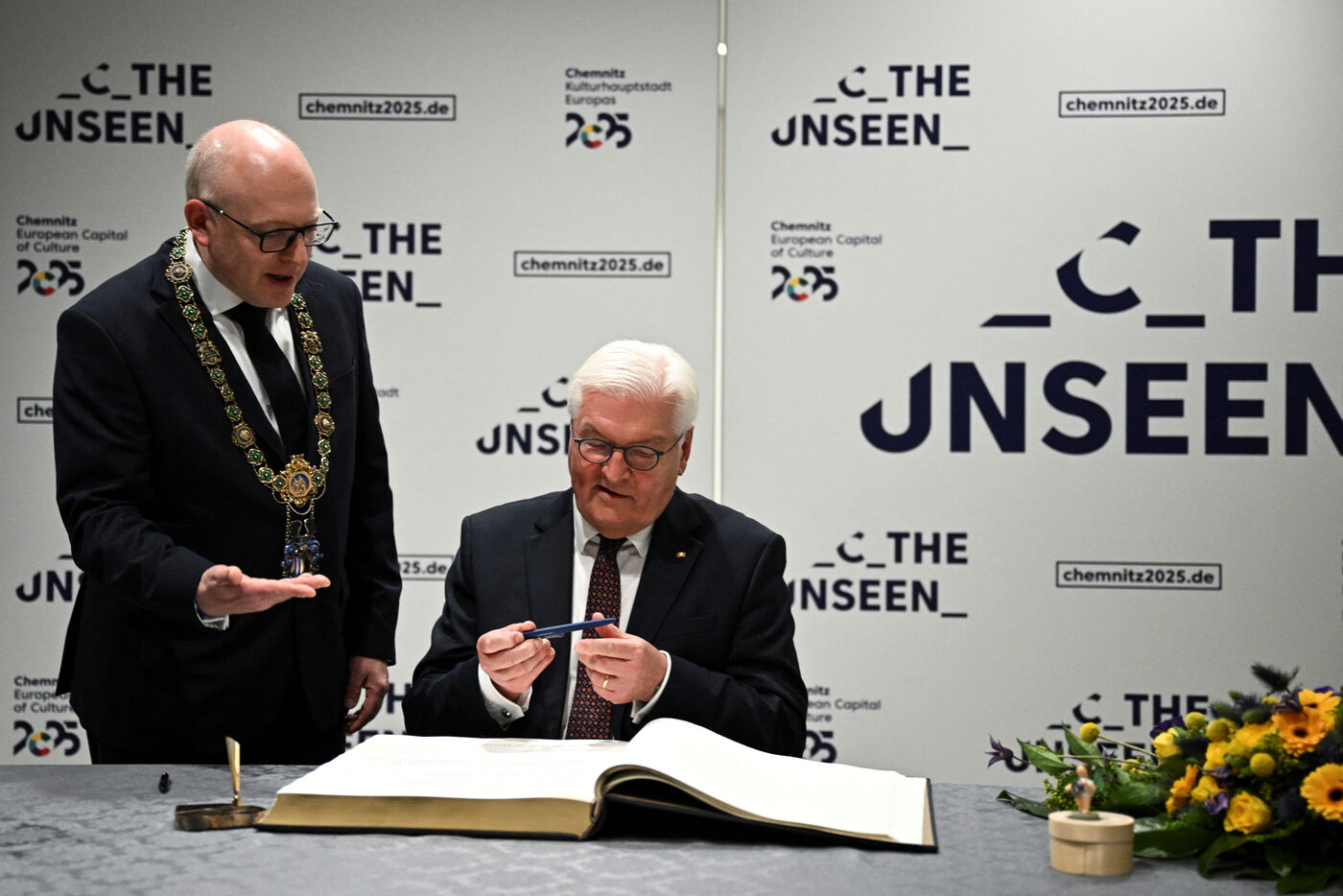 Das Staatsoberhaupt und Sachsens Ministerpräsident Michael Kretschmer schrieben sich ins Gästebuch der Stadt ein.