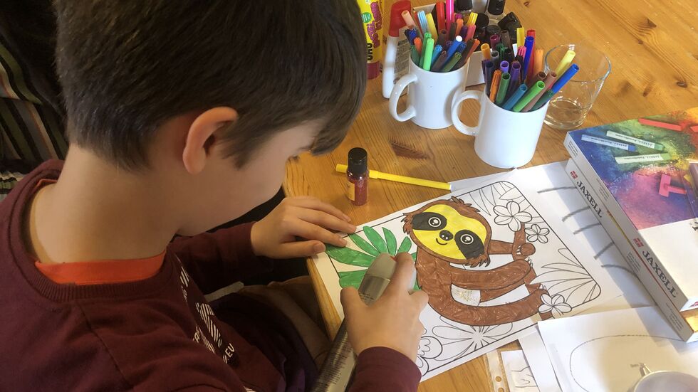 Der achtjährige Carl malt und bastelt bei der Kunsttherapie am liebsten Faultiere und er ist davon überzeugt: „Die sind gar nicht faul, die sparen nur Energie“.
