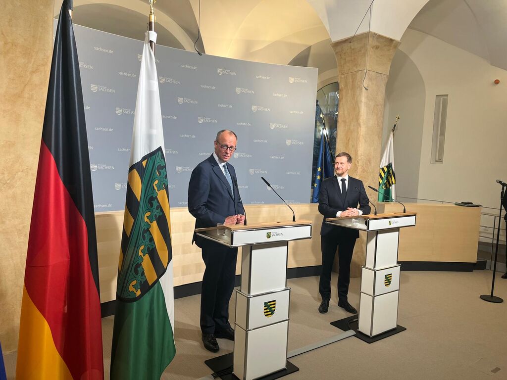 Für die Bundesregierung sei die Sanierung und Modernisierung bestehender Verkehrswege zentral. Es gehe aber auch um neue Verkehrswege. Merz erwähnte den Ausbau der Bahnstrecke von Dresden über Görlitz nach Breslau sowie die Verbindung von Dresden nach Prag. Sie seien noch nicht ausreichend finanziert. Darüber werde man im Bund noch einmal zu sprechen haben. Auf seine umstrittenen Äußerungen zu Migranten im Stadtbild ging Merz bei einem Statement nicht ein.