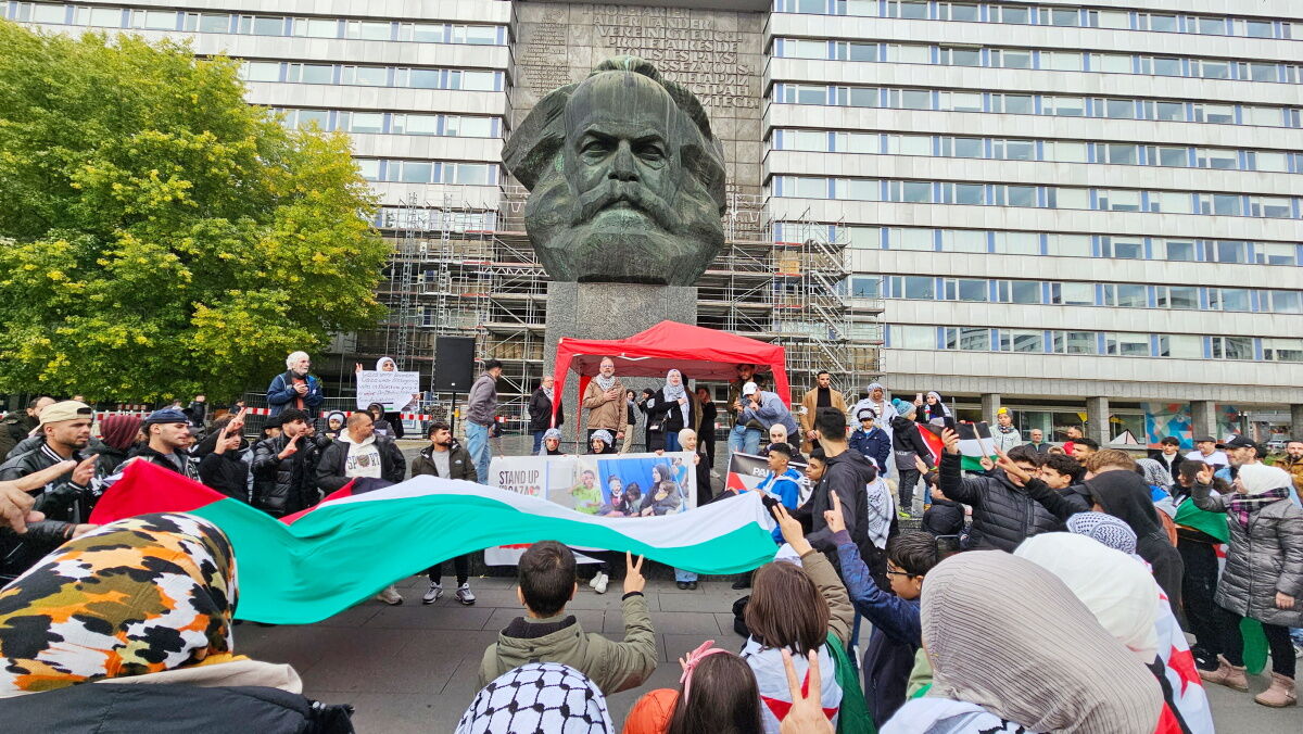 Am Samstag gab es in Chemnitz vor dem Karl-Marx-Monument eine Pro-Palästina-Kundgebung. Das Motto lautete:„ Frieden für Palästina“.