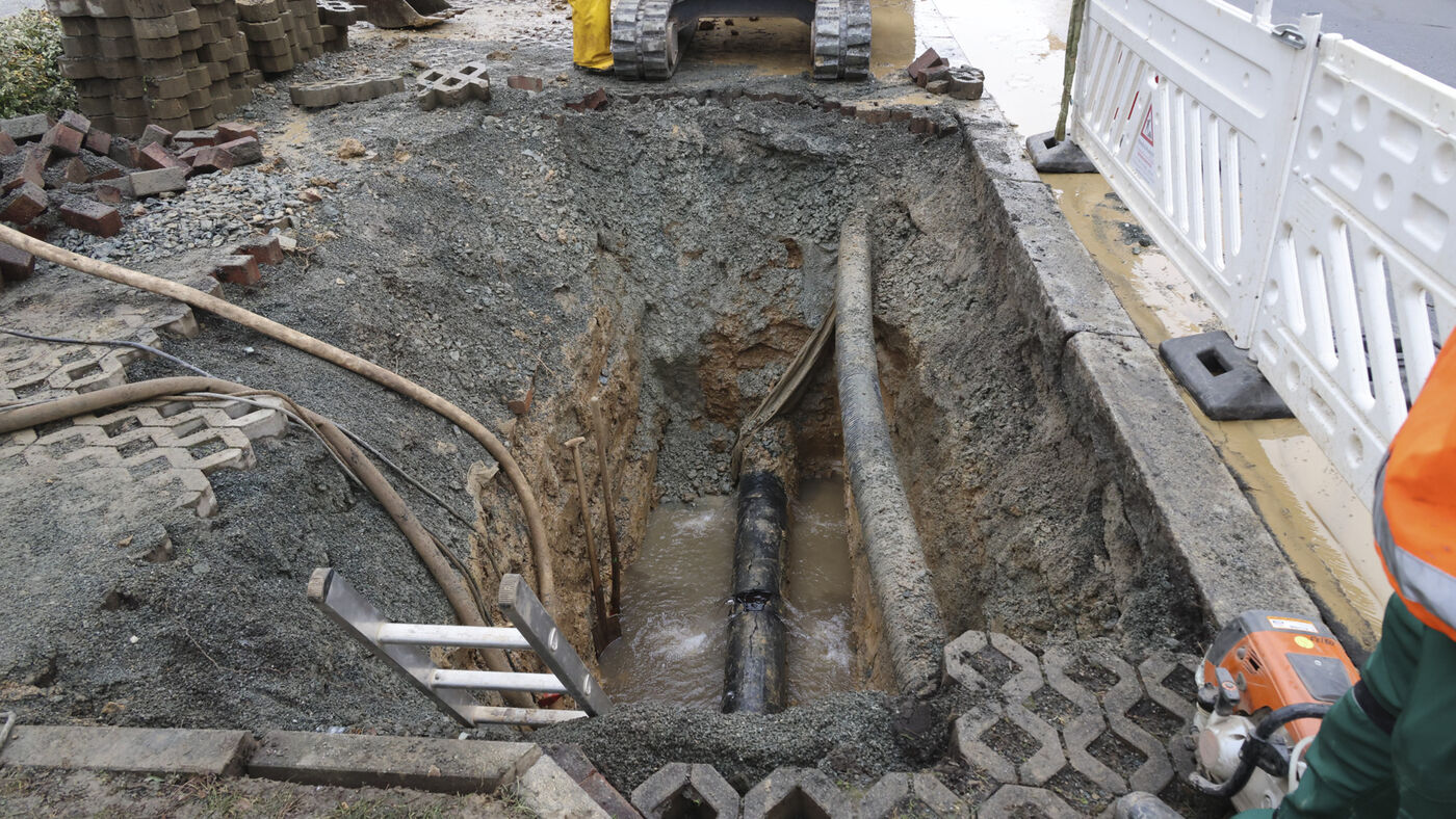 - Arbeiter haben den Fußweg aufgerissen, um an das kaputte Rohr zu gelangen.