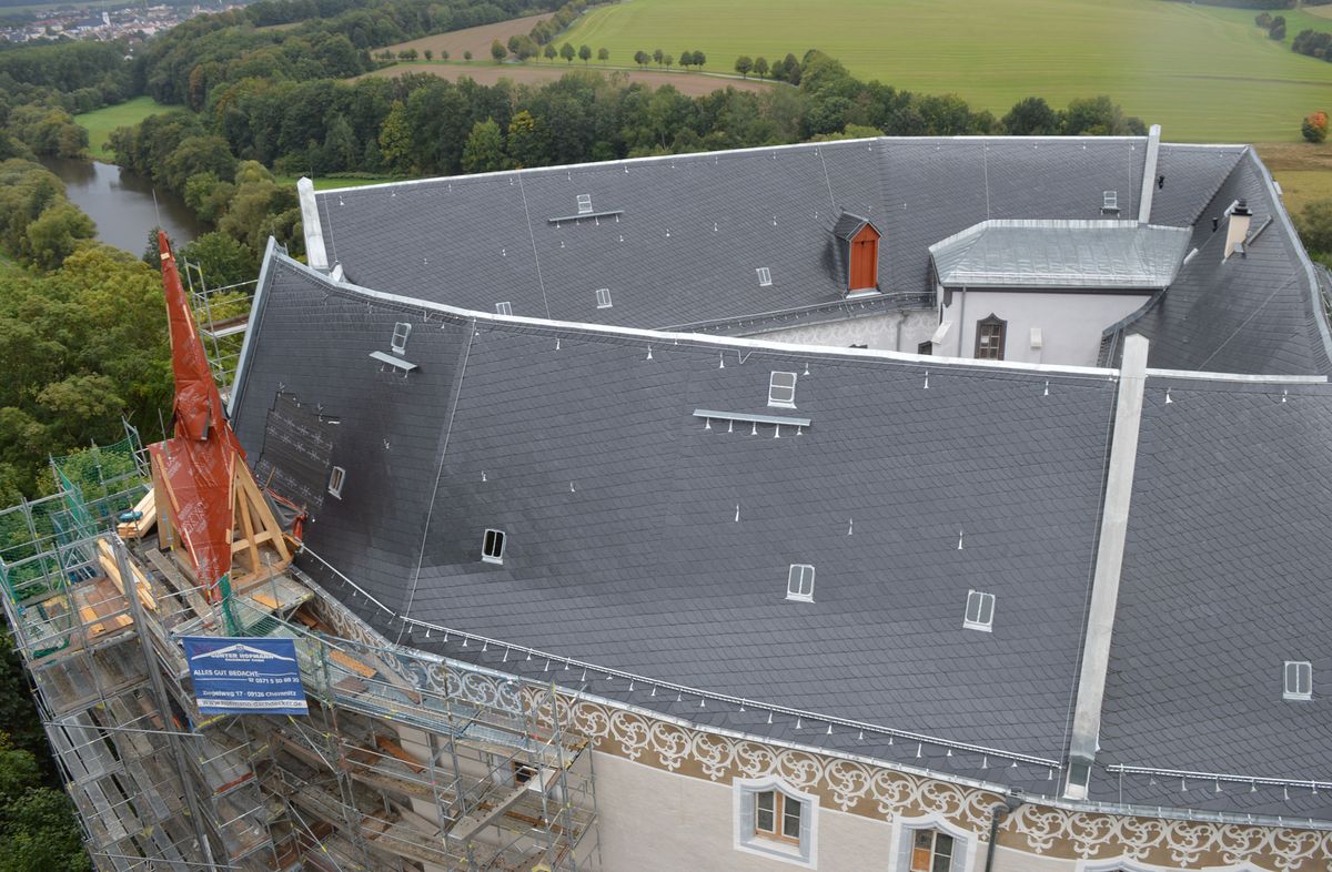 Inzwischen ist die gesamte Gebäudehülle des Schlosses auf Vordermann gebracht, inklusive Dächern und Fassaden.