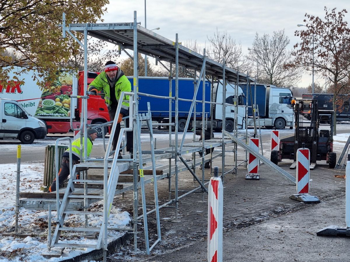 Auf dem Rastplatz „Auerswalder Blick“ an der A4 haben Arbeiter am Donnerstag ein Schneeräumgerüst für LKW aufgebaut. Damit sollen die Fahrer die Möglichkeit haben, ihre Sattelzüge von Schnee und Eis zu befreien. Die Idee für das Gerüst kam von der Autobahnpolizei. Unterstützt wird die Aktion unter anderem auch von der Dekra. Hintergrund ist die Gefahr, die von Eisschollen ausgeht, die von LKW-Dächern und Planen auf die Fahrbahn fallen. Jedes Jahr kommt es dadurch zu Unfällen. Das Schneeräumgerüst soll nächste Woche einsatzbereit sein.
