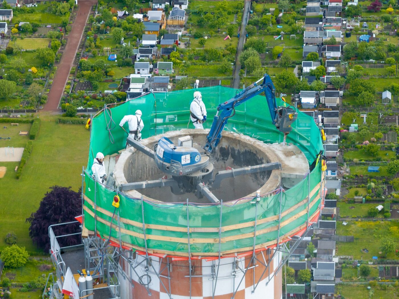 Im oberen Bereich können die Abriss-Experten der Firma Mende rund zwei Meter am Tag abtragen, weiter unten ist nur etwa ein Meter, da der Durchmesser größer ist. Die Arbeiten dauern bis Anfang nächsten Jahres. Dann ist nur noch ein etwa 30 Meter hoher Stumpf übrig, der vom Boden aus abgerissen wird.
