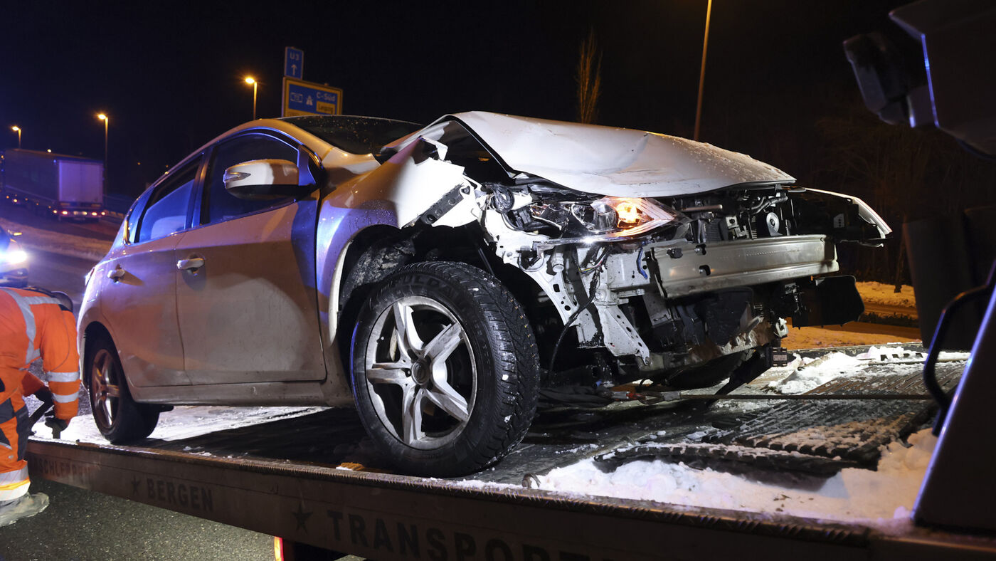 - Der demolierte Nissan auf dem Abschlepper.