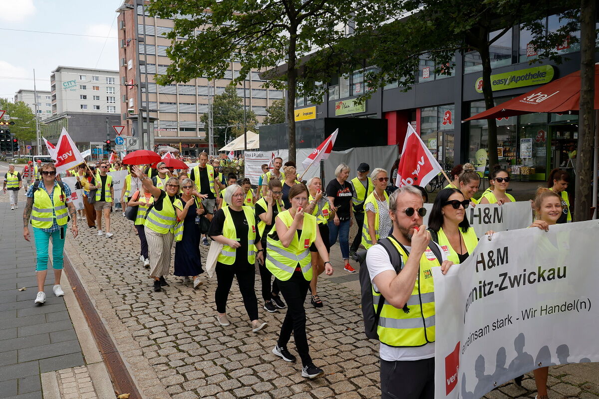 Mit einer Kundgebung vor der Edeka-Zentrale an der Brückenstraße sind am Donnerstagvormittag die Streiks im sächsischen Einzelhandel weitergegangen. An der anschließenden Demo durch die Innenstadt beteiligten sich Beschäftigte verschiedener Handelsketten unter anderem aus Chemnitz, Zwickau und Leipzig.