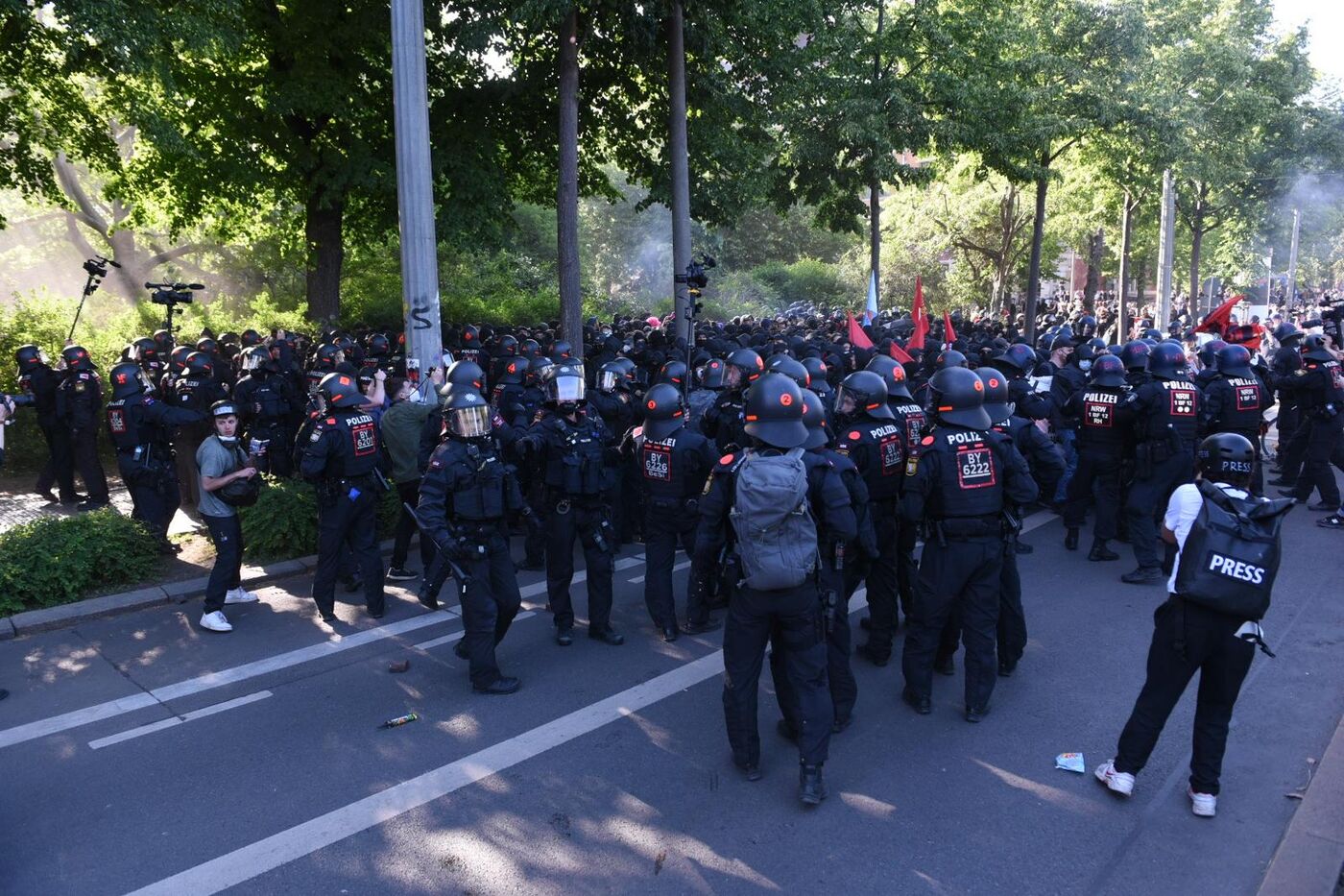 Bei den „massiven Ausschreitungen“ sind laut Polizei etwa 50 Polizisten verletzt worden. Zudem habe es auch Verletzte aufseiten der Demonstranten gegeben, sagte Polizeipräsident René Demmler - die genaue Zahl konnte er nicht beziffern. Ermittlungen laufen bei der Polizei etwa wegen schweren Landfriedensbruchs und Angriffen auf Polizisten. Außer den Festnahmen seien zwischen 40 und 50 Personen in Gewahrsam genommen und bis Sonntagmittag wieder entlassen worden. Zudem mussten die Eingekesselten teils über Stunden ausharren, damit die Polizei ihre Identitäten registrierte. „Kurz nach 5.00 Uhr stellten die Bearbeitungstrupps die letzte Identität fest“, hieß es.