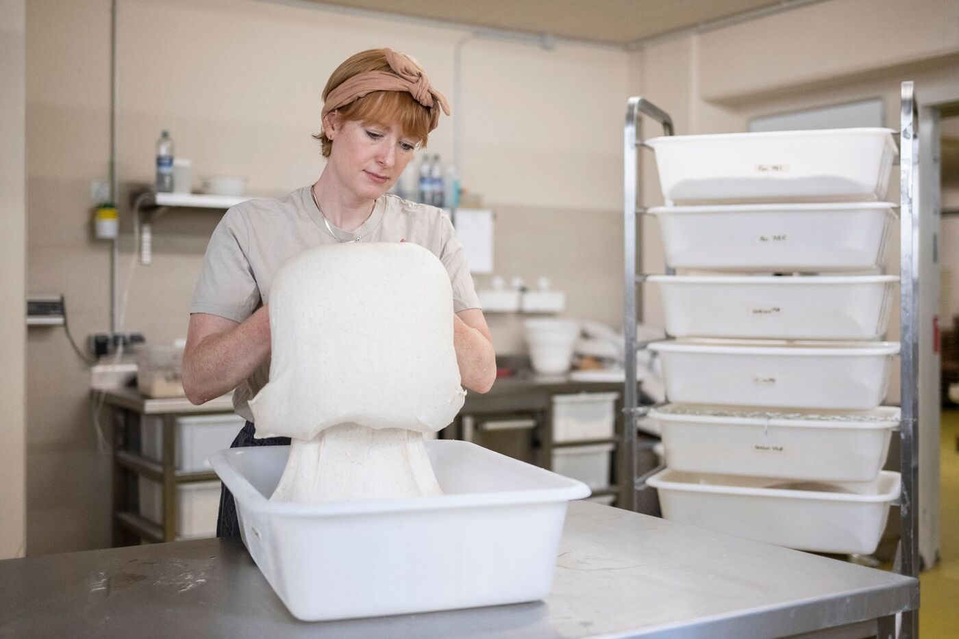 Der Teig müsse nach der Herstellung 24 bis 44 Stunden ruhen. Und das in mehreren Etappen und bei unterschiedlichen Temperaturen. Der Weizensauerteig zum Beispiel werde vor seiner 24-stündigen Ruhephase alle 30 Minuten händisch gefaltet. „Damit er die typischen Poren bekommt.“