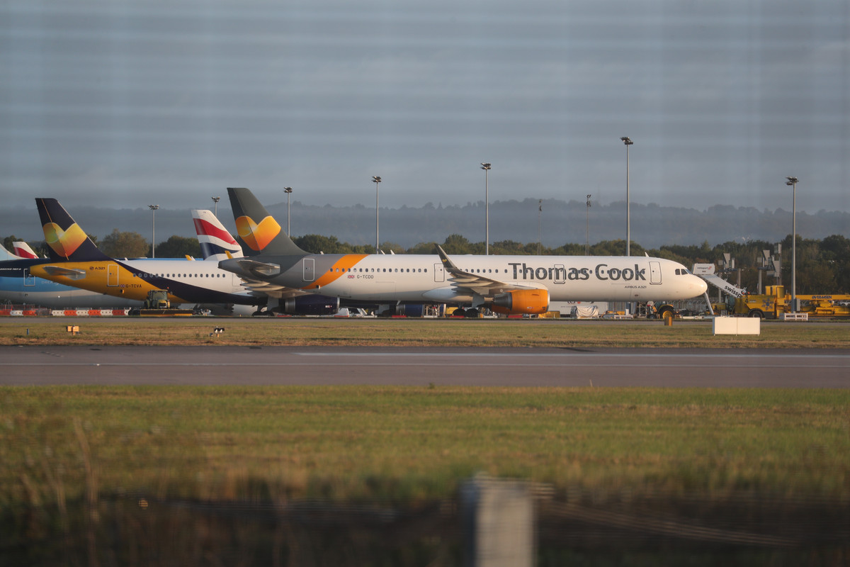 - Gatwick: Ein Airbus A321 von der Fluggesellschaft Condor mit dem Design des Tourismuskonzerns Thomas Cook steht auf dem Rollfeld am Gatwick Airport in Sussex. Nach dem Insolvenzantrag des britischen Touristikkonzerns Thomas Cook hat das deutsche Tochterunternehmen Condor bei der Bundesregierung einen Überbrückungskredit beantragt. Foto: Steve Parsons/PA Wire/dpa