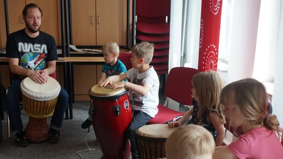 Am Dienstag, den 4. Juni, schwebten gegen Nachmittag rhythmische Klänge aus dem oberen Stockwerk des Kinder- und Jugendheimes in Burgstädt. Mal sanft und leise, mal laut und grob klangen die afrikanischen Trommeln. „Kongas“ und „Djembe“ nennen sich die Instrumente, die gespielt werden, erklärte uns Markus Barthold. Er spielt „Percussions“, ein Oberbegriff für Schlaginstrumente, seit mehr als 22 Jahren. Vor 15 Jahren gründete er eine Trommelschule, mittlerweile gibt er nur noch Workshops, leitet punktuell Gruppen an. Es ist ein Pilotprojekt in der Beethovenstraße, das wir aus Spenden der Radio Dresden Aktion „Herzenssache“ finanzieren und das bei genügend Anklang vielleicht bald öfter stattfindet.