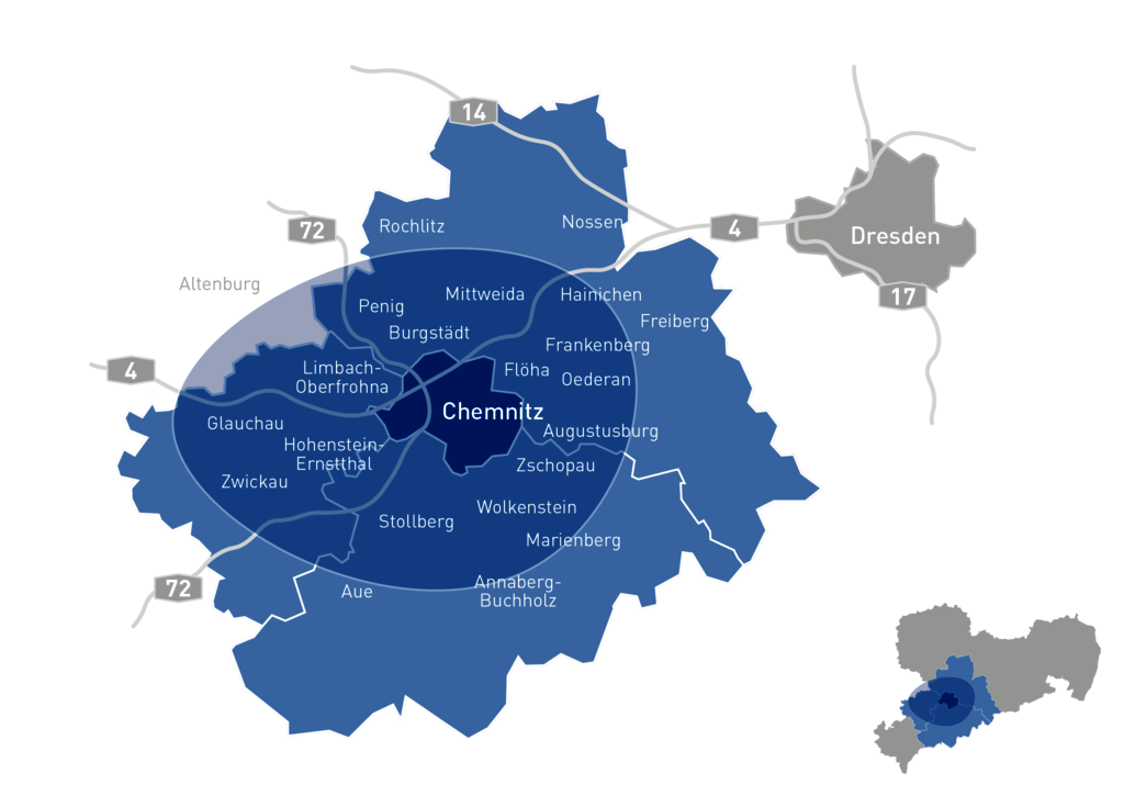 Radio Chemnitz hören Sie sowohl im Stadtgebiet Chemnitz inkl. Umland als auch in den Landkreisen Mittelsachsen sowie in Teilen der Landkreise Zwickau, Erzgebirgskreis und Altenburger Land. Auf unserer Karte sehen Sie, mit welcher Frequenz Sie uns in welchem Gebiet empfangen können.