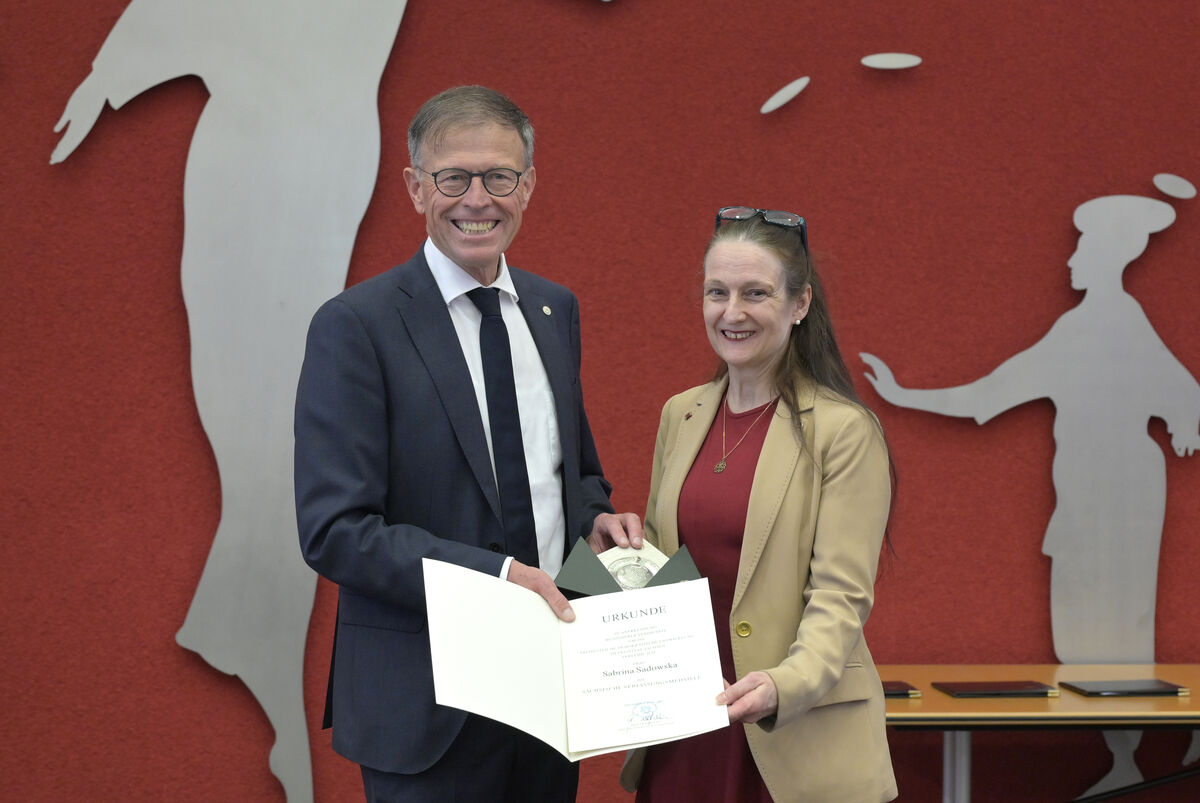 - Landtagspräsident Matthias Rößler überreicht Sabrina Sadowska die Auszeichnung.