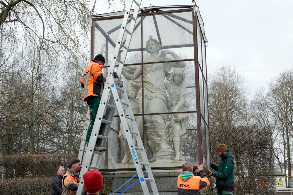 - Mitarbeiter des Grünflächenamtes hieven die Einhausungen von den Figuren.